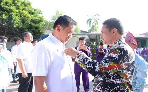 Pj Sekda Fery, yang dikenal sebagai salah satu siswa berprestasi selama masa sekolahnya, secara simbolis menyematkan Pin Pengukuhan kepada Ketua Umum IKA Smansa terpilih, Budi Utama, untuk periode 2025-2030.